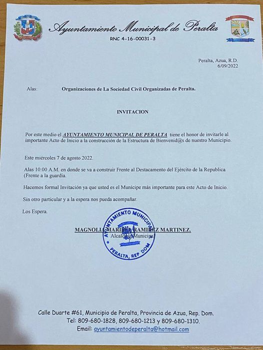 Atención Municipe de Peralta, nuestro Ayuntamiento Municipal les complace invitarlo al acto del primer Picazo para la construcción de nuestra entrada Municipal, el cuál se estará realizando este Miércoles 07 de septiembre a las 10:00 am, los esperamos.