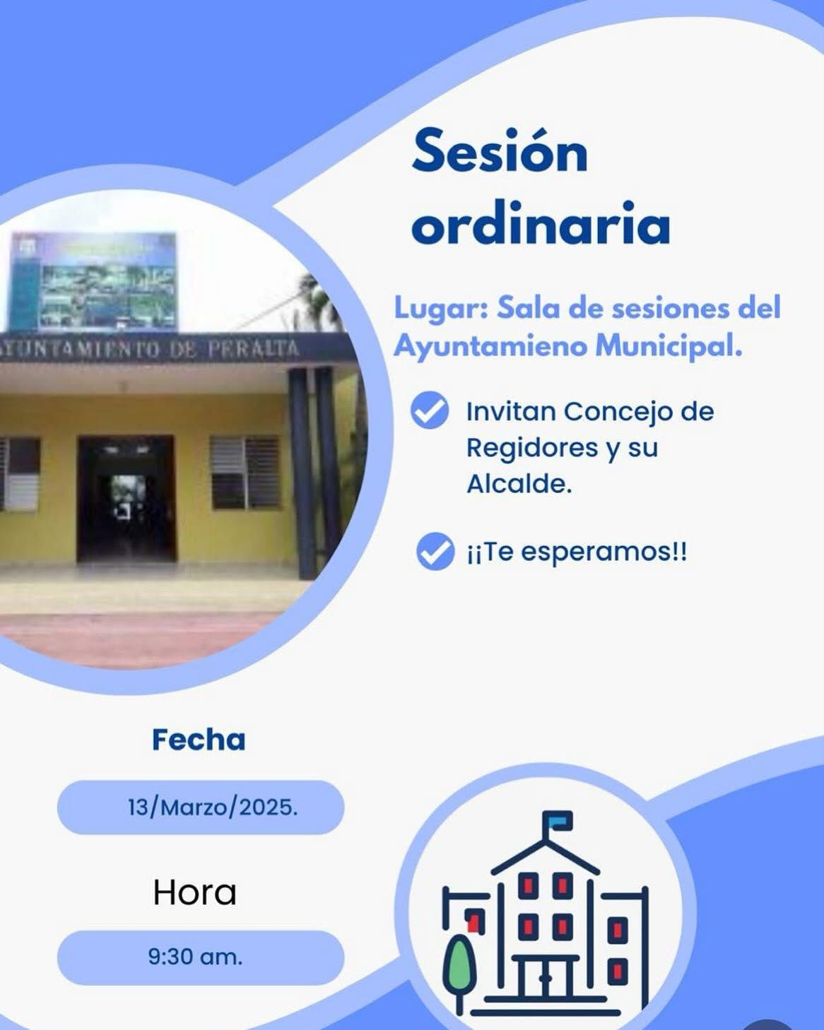 En el día de hoy nos complace invitarles a todos los habitantes de nuestro municipio a la sección ordinaria que se estará realizando en la sala de secciones del ayuntamiento municipal este 13 de Marzo del 2025. A las 9:30 am.