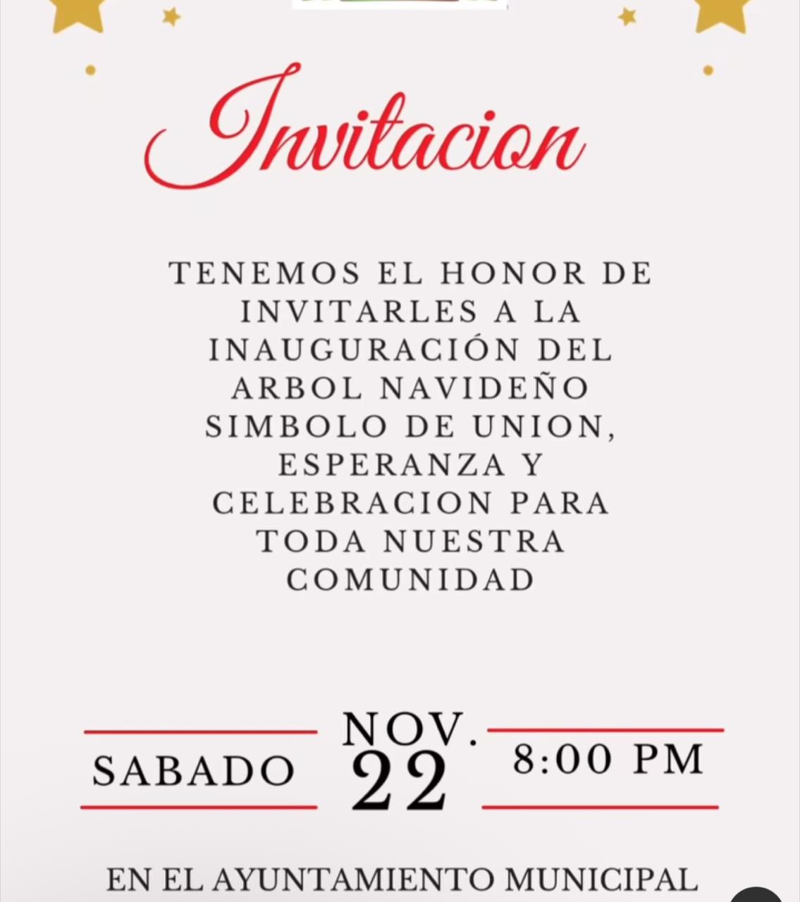 noviembre 21, 2025 Tenemos el honor de invitarles a la inauguración del árbol navideño en el Ayuntamiento Municipal Comparte y Comenta